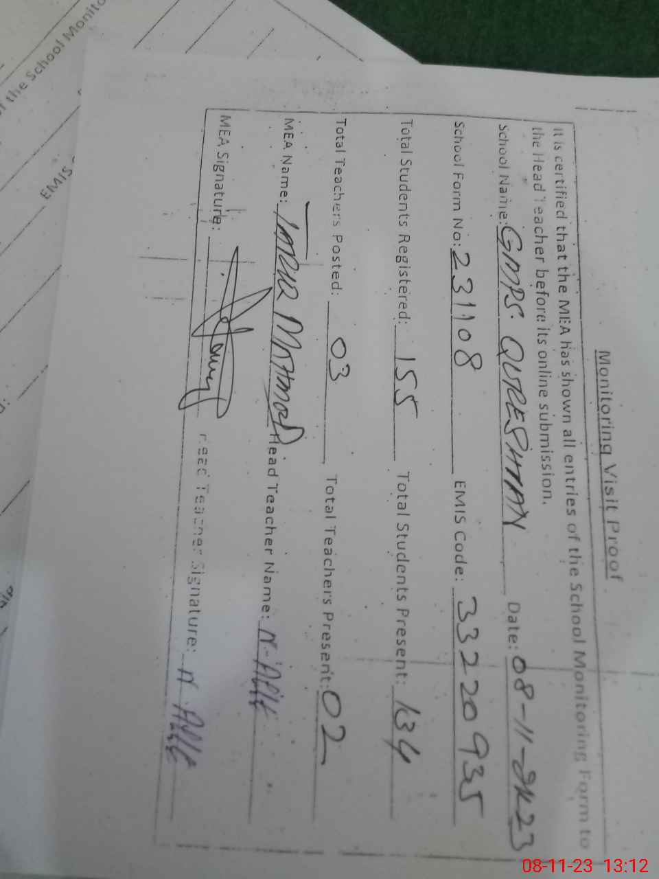 | Attendance Register | Head Teacher | MEA with School | Visit Proof |