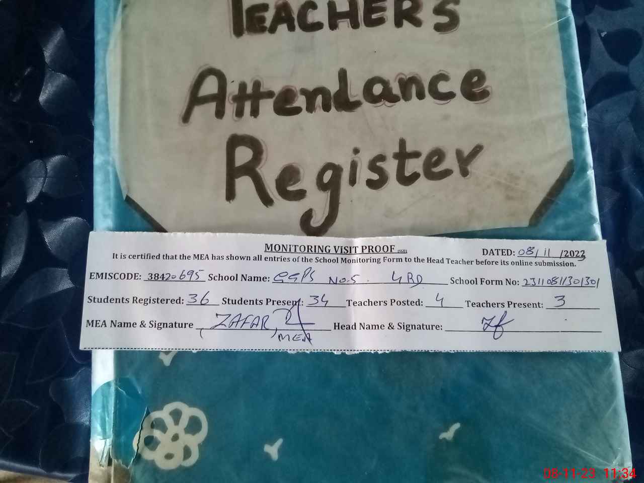 | Attendance Register | Head Teacher | MEA with School | Visit Proof |