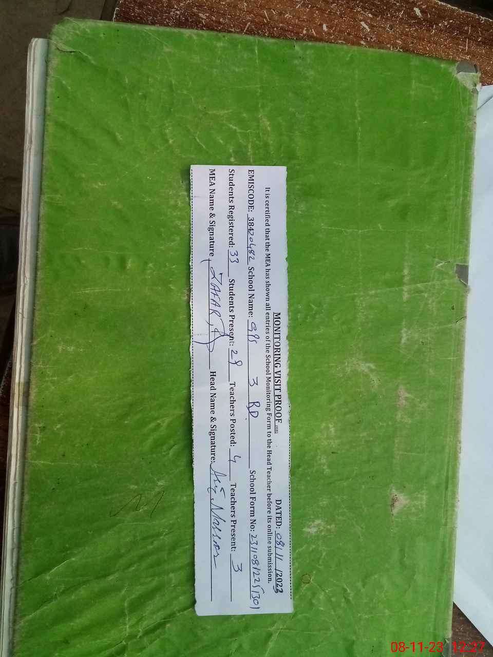 | Attendance Register | Head Teacher | MEA with School | Visit Proof |