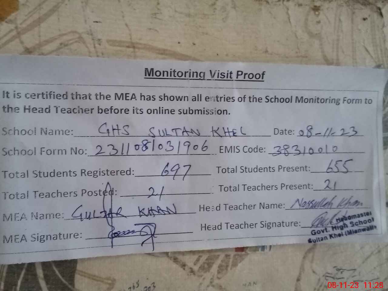 | Attendance Register | Head Teacher | MEA with School | Visit Proof |
