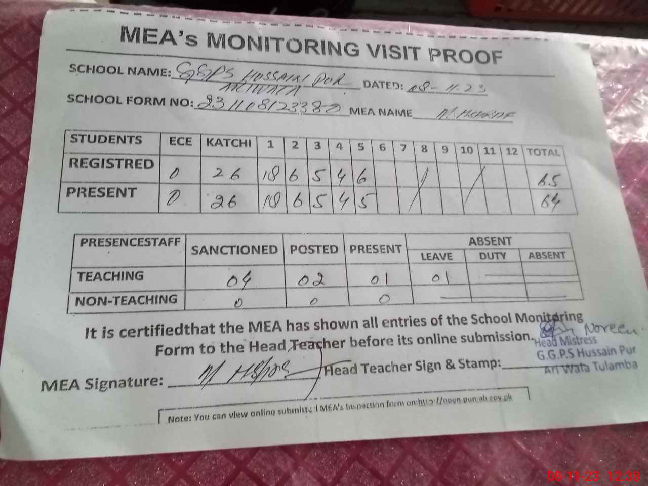 | Attendance Register | Head Teacher | MEA with School | Visit Proof |