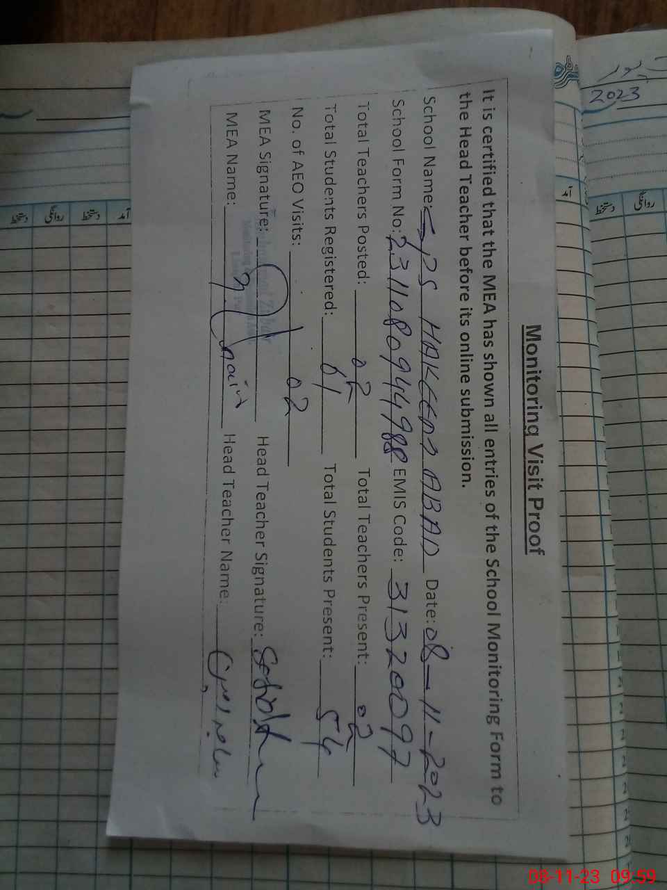 | Attendance Register | Head Teacher | MEA with School | Visit Proof |