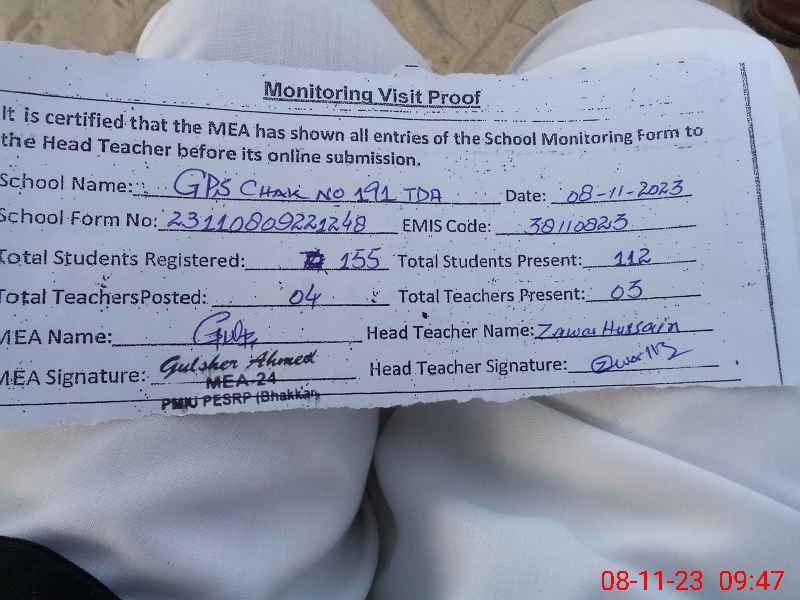 | EMIS Code: 38110823 | Name of School: GPS CHAK NO 191 TDA | |||