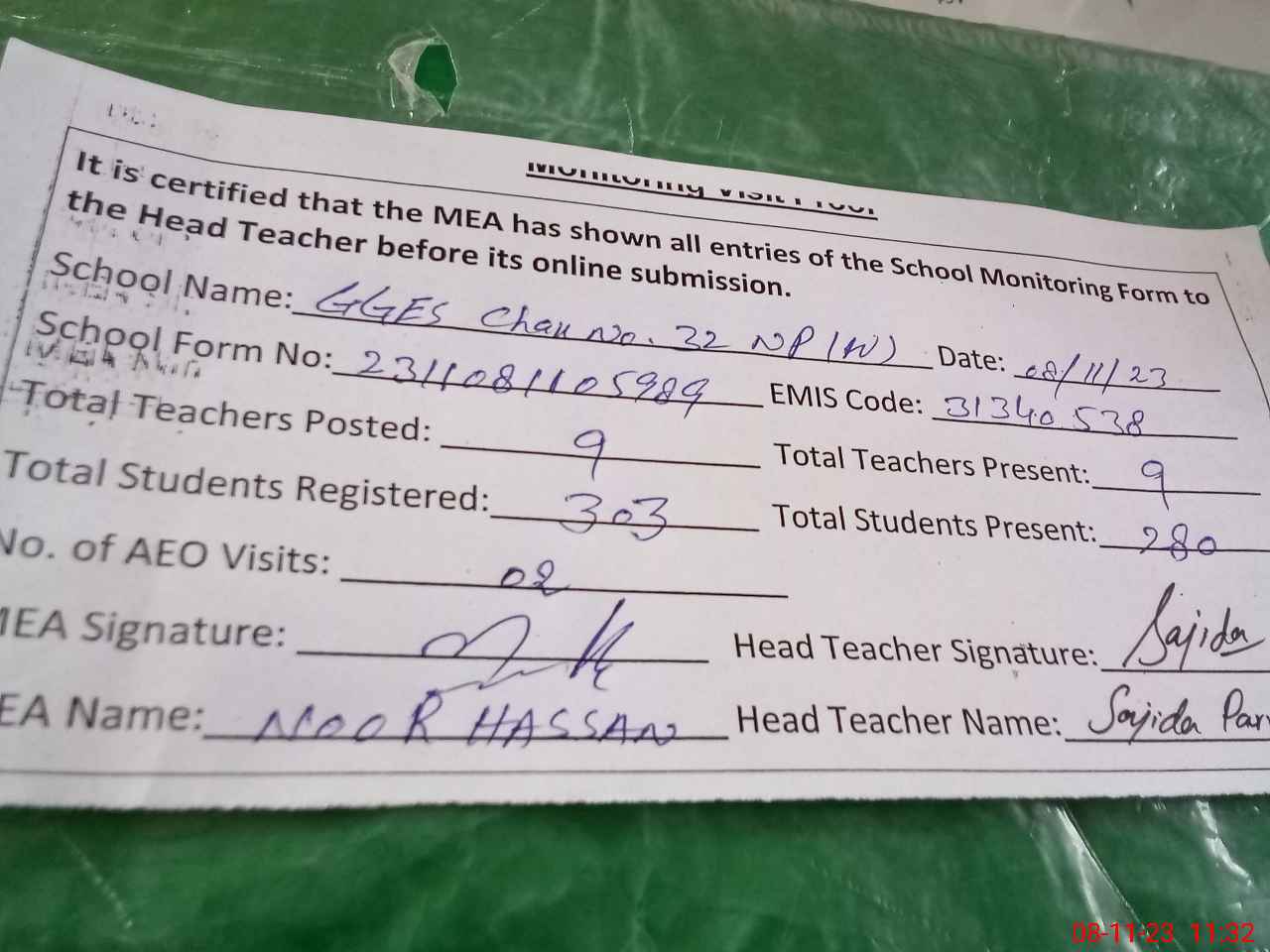 | Attendance Register | Head Teacher | MEA with School | Visit Proof |