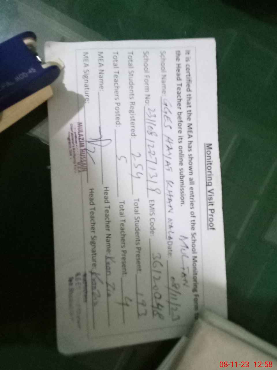 | Attendance Register | Head Teacher | MEA with School | Visit Proof |