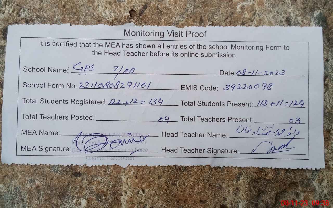 | Attendance Register | Head Teacher | MEA with School | Visit Proof |