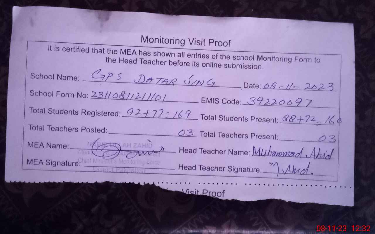 | EMIS Code: 39220097 | Name of School: GPS DATAR SINGH | |||