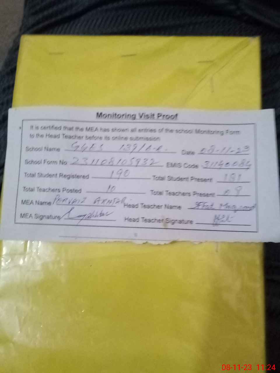 | Attendance Register | Head Teacher | MEA with School | Visit Proof |