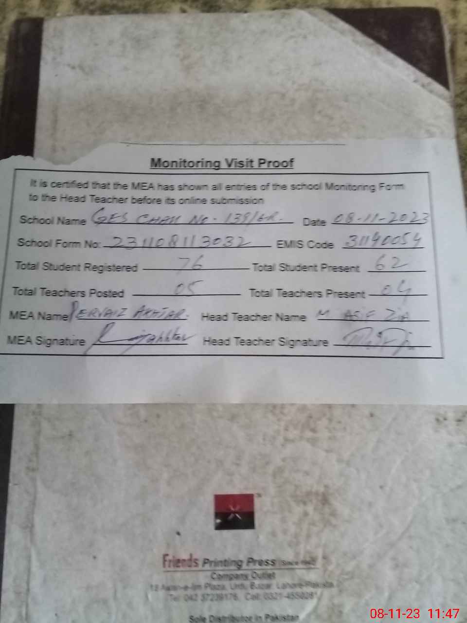 | Attendance Register | Head Teacher | MEA with School | Visit Proof |