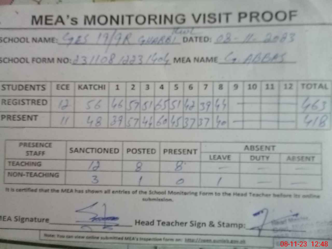 | Attendance Register | Head Teacher | MEA with School | Visit Proof |