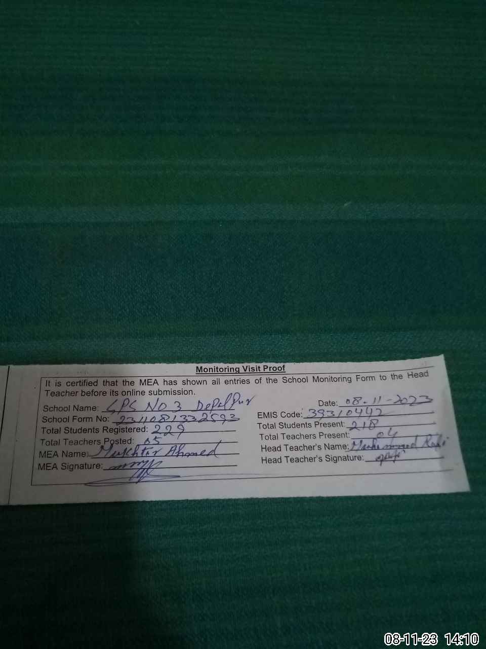 | Attendance Register | Head Teacher | MEA with School | Visit Proof |
