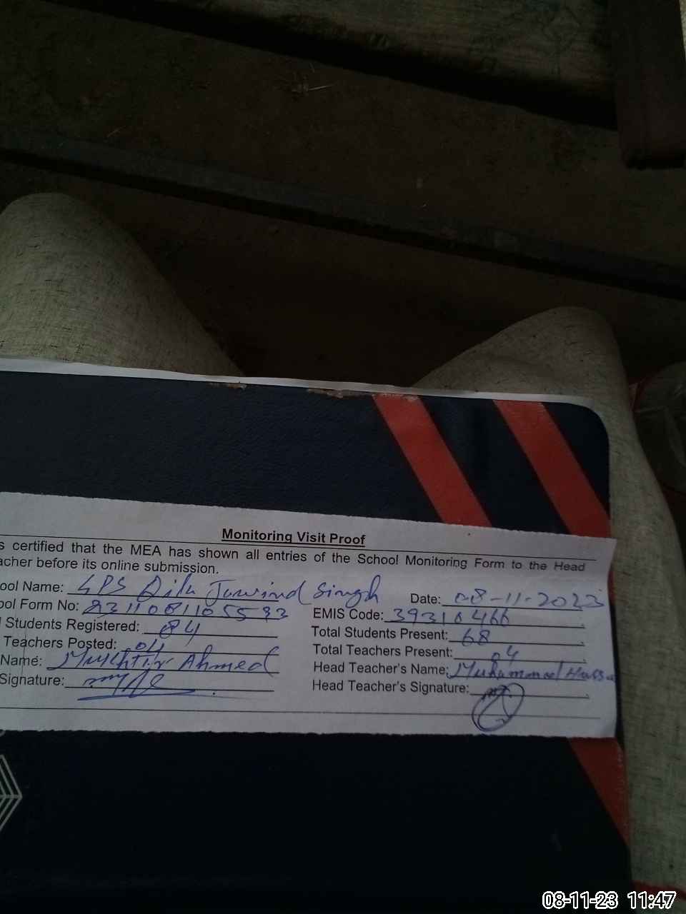 | Attendance Register | Head Teacher | MEA with School | Visit Proof |