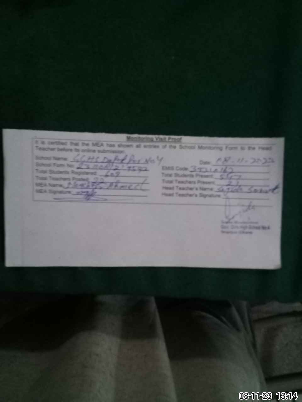 | Attendance Register | Head Teacher | MEA with School | Visit Proof |