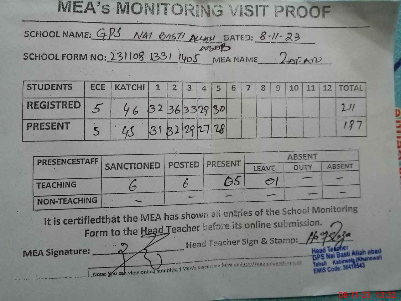 | EMIS Code: 36410543 | Name of School: GPS NAI BASTI ALLAH ABAD, KABIRWALA | |||
