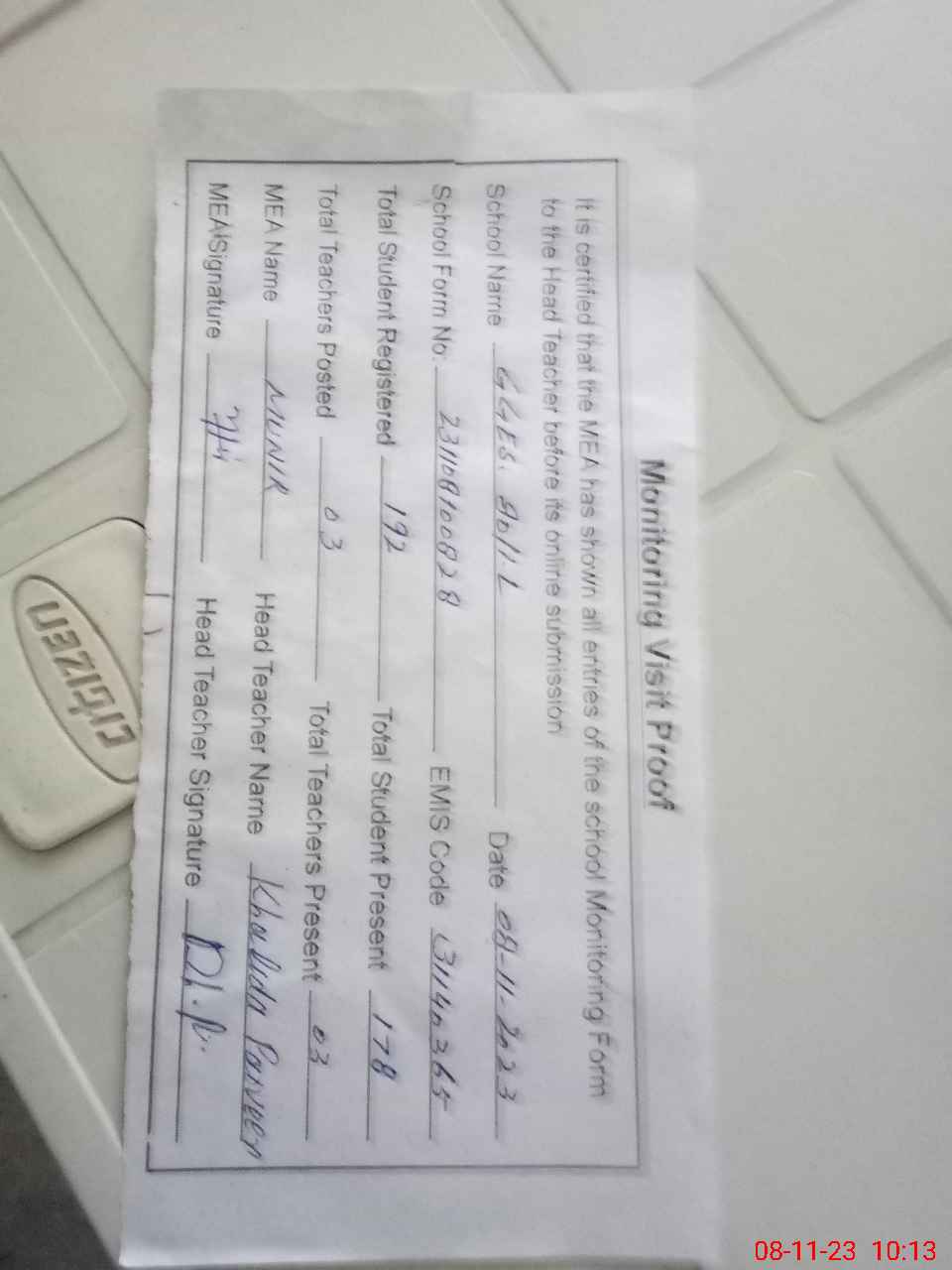 | Attendance Register | Head Teacher | MEA with School | Visit Proof |