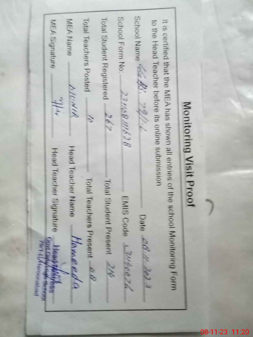 | Attendance Register | Head Teacher | MEA with School | Visit Proof |