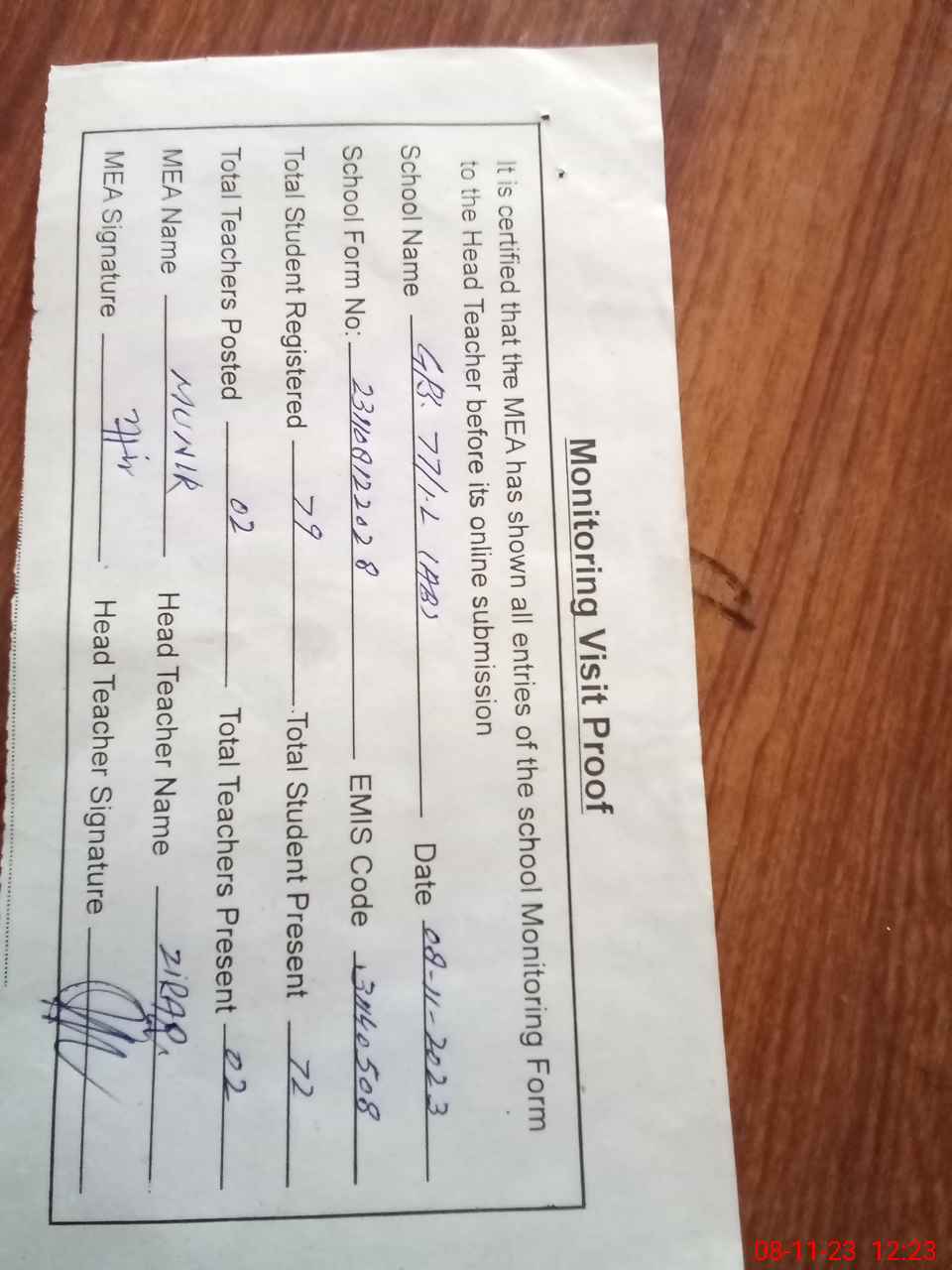| Attendance Register | Head Teacher | MEA with School | Visit Proof |