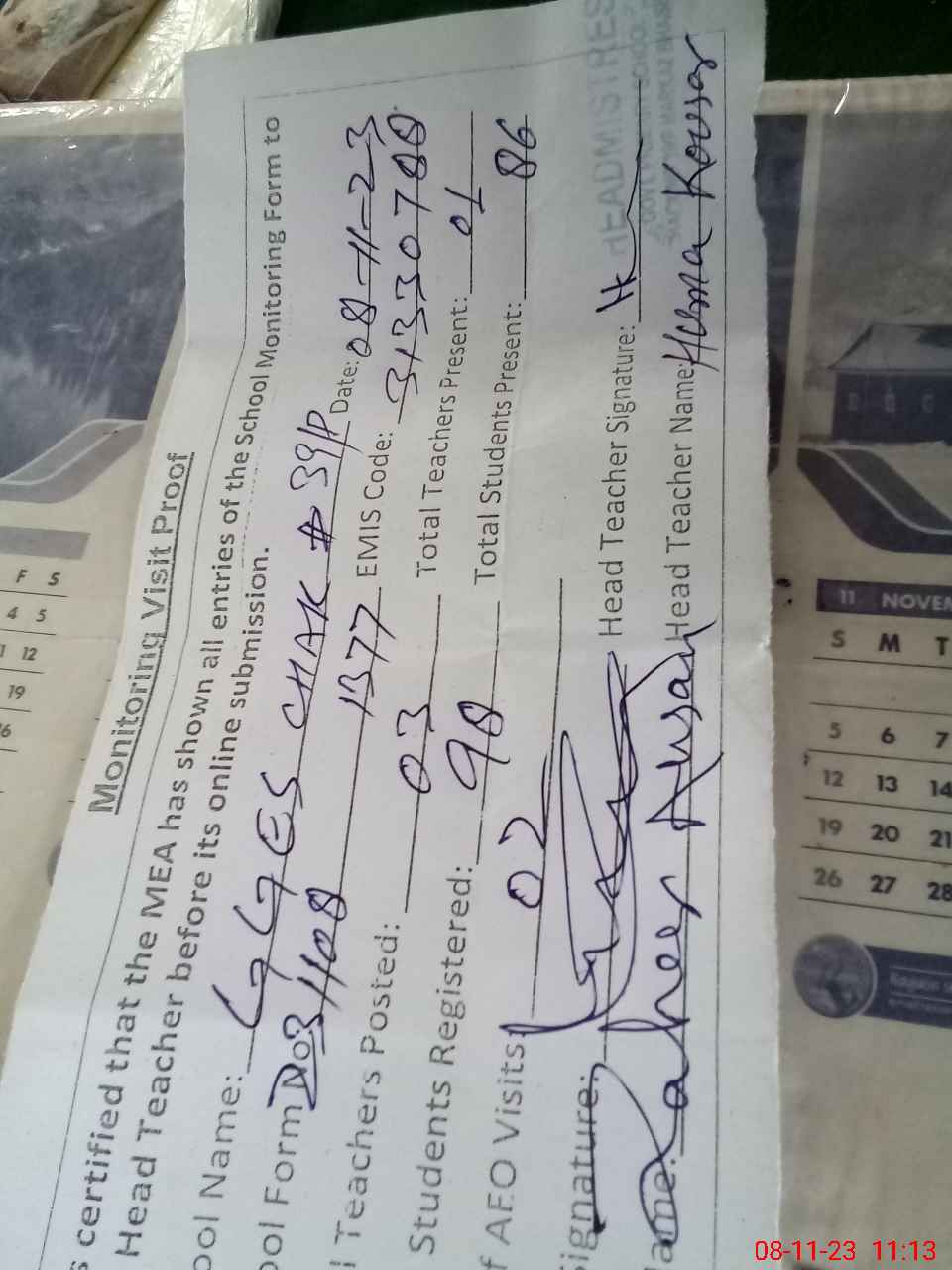 | Attendance Register | Head Teacher | MEA with School | Visit Proof |
