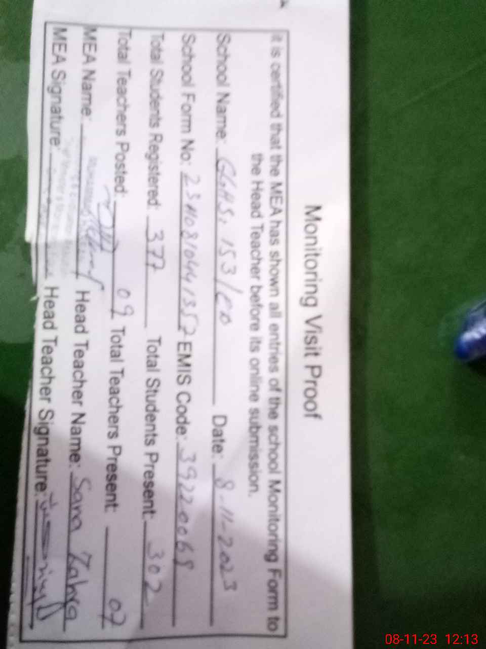| Attendance Register | Head Teacher | MEA with School | Visit Proof |