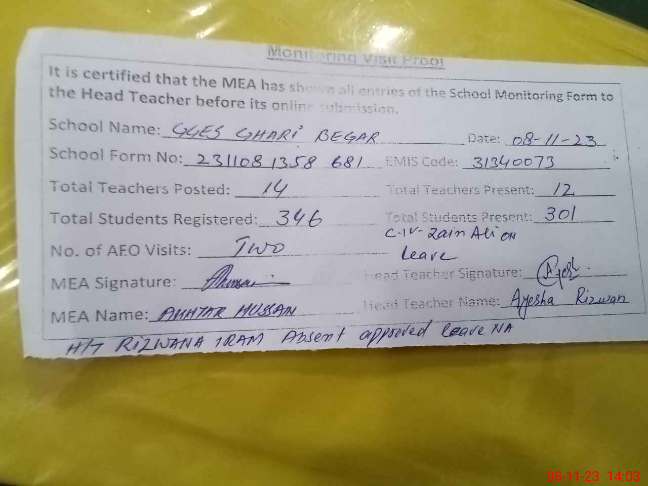 | Attendance Register | Head Teacher | MEA with School | Visit Proof |