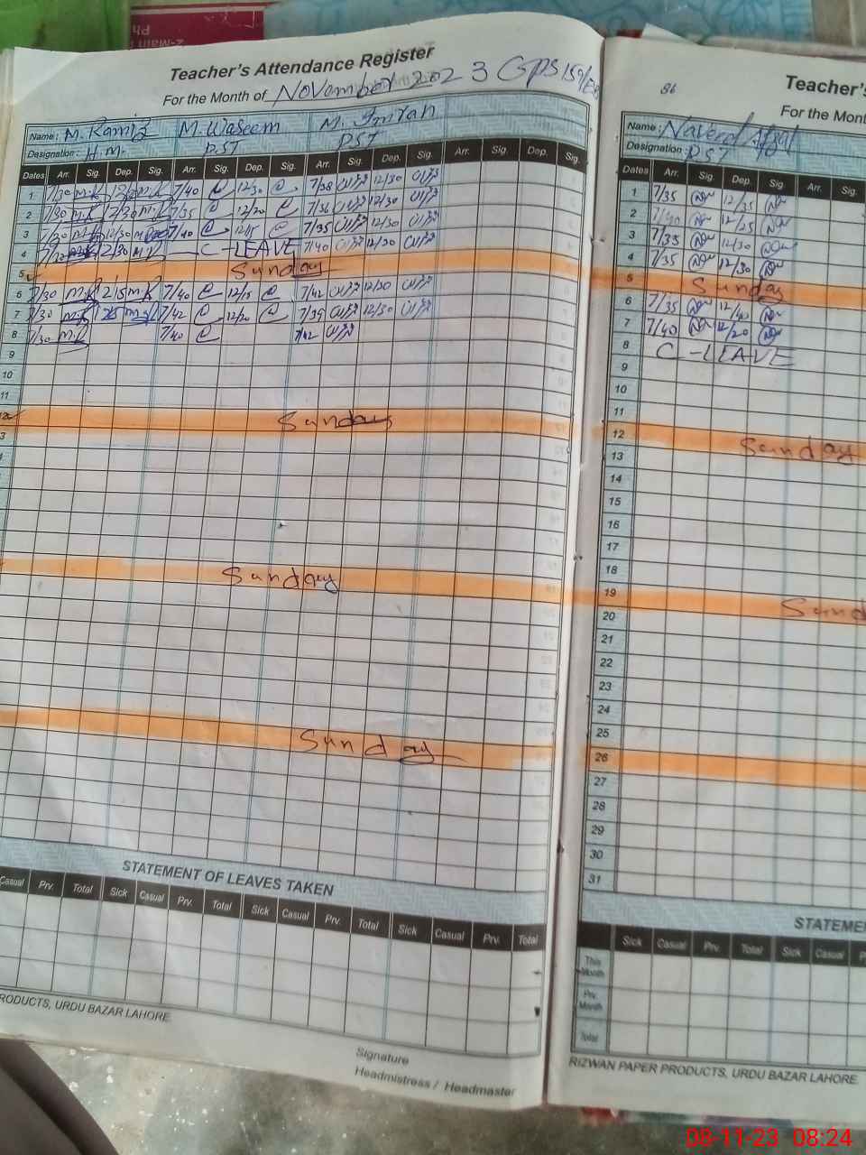 | CNIC | Full Name | Designation | R/C | Absence During Last Calender Month |