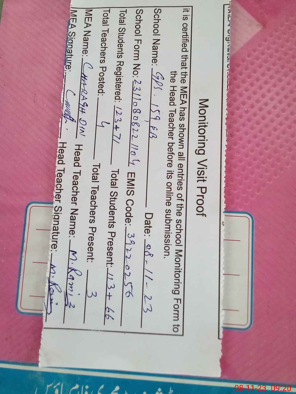 | Attendance Register | Head Teacher | MEA with School | Visit Proof |