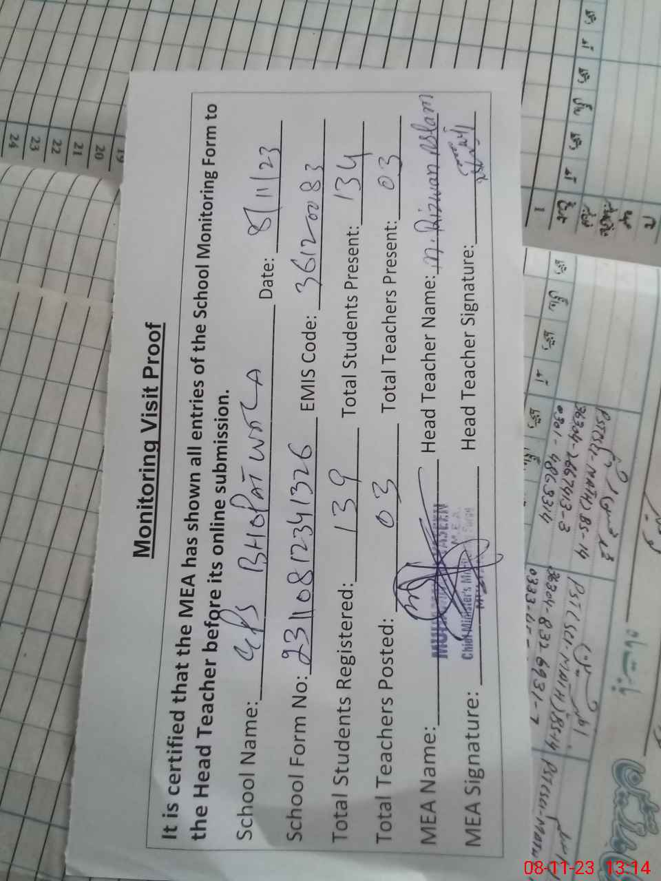 | Attendance Register | Head Teacher | MEA with School | Visit Proof |