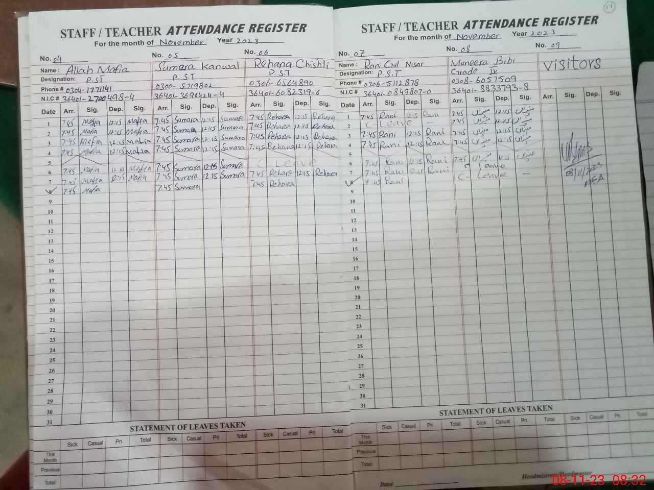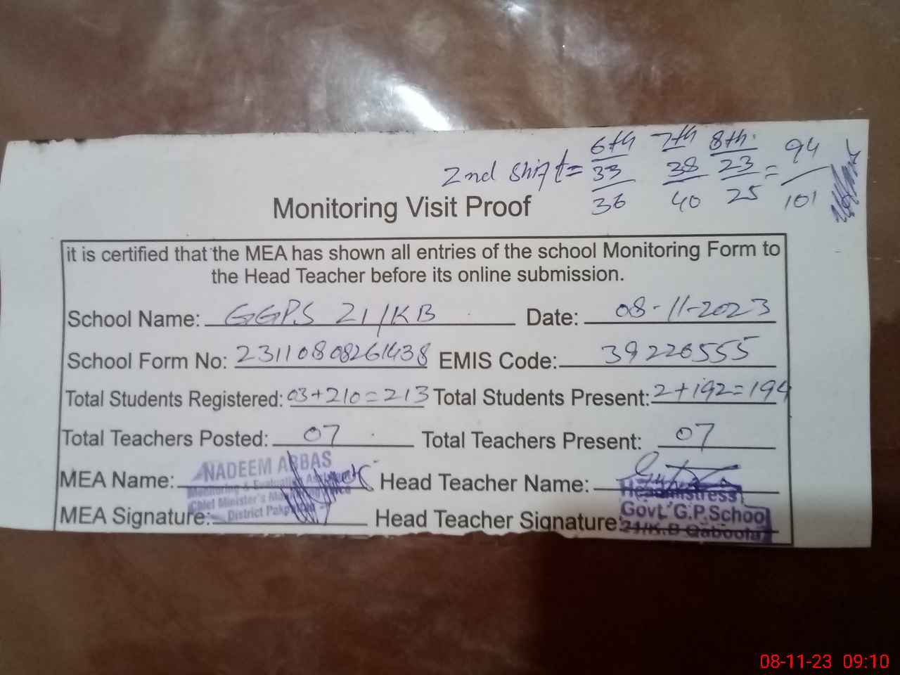 | Attendance Register | Head Teacher | MEA with School | Visit Proof |