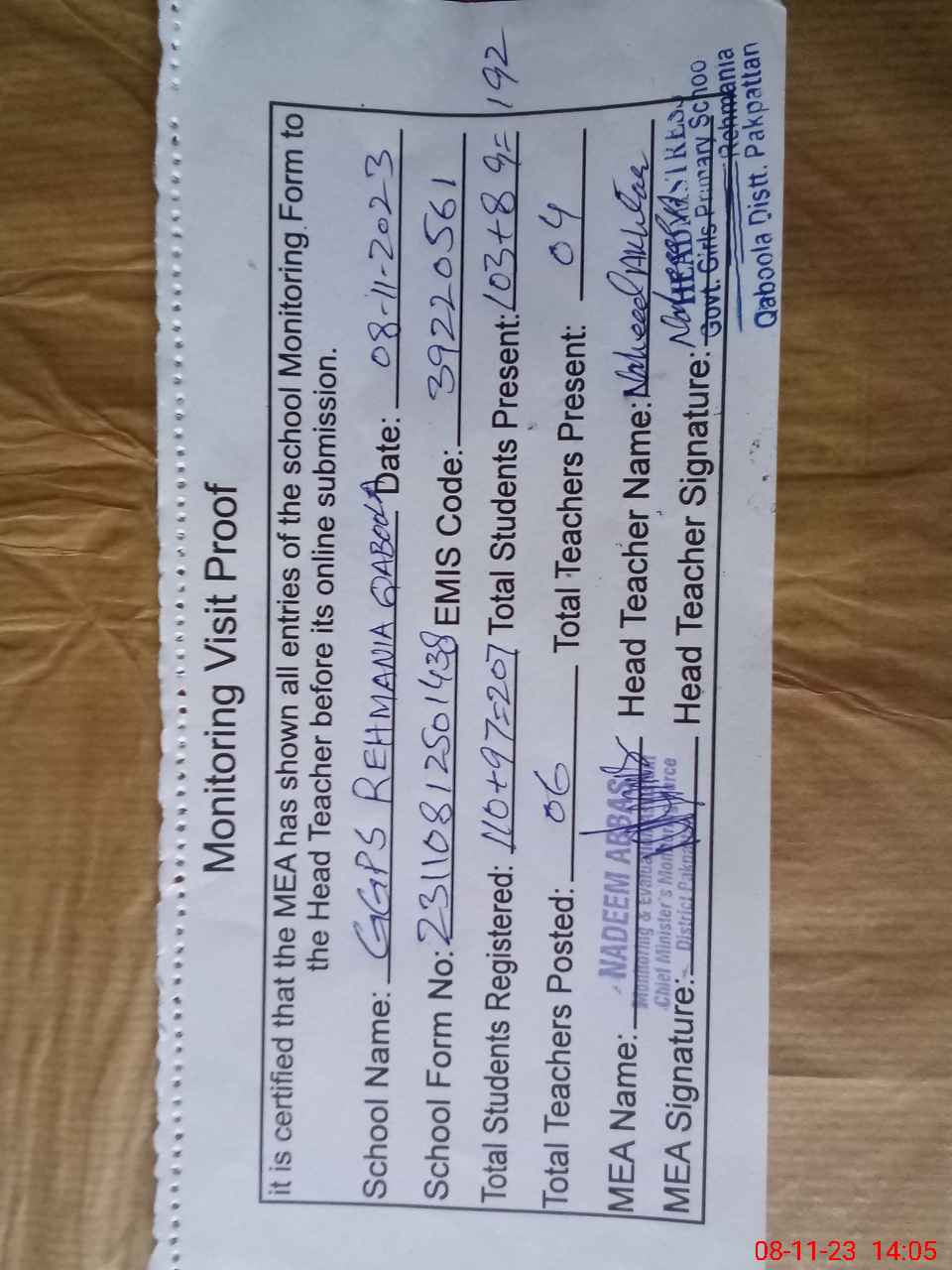 | Attendance Register | Head Teacher | MEA with School | Visit Proof |