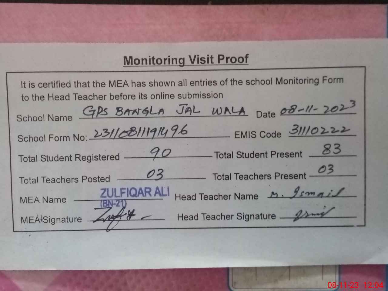 | Attendance Register | Head Teacher | MEA with School | Visit Proof |