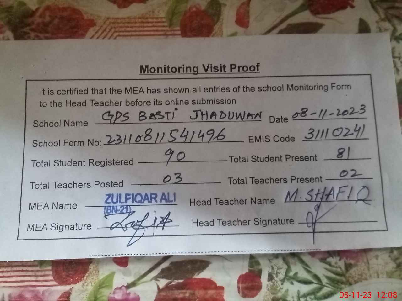 | Attendance Register | Head Teacher | MEA with School | Visit Proof |