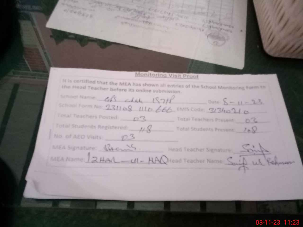 | Monitoring Date: 08-11-2023 | Start Time: 08-11-2023 10:46 AM | End Time: 08-11-2023 11:27 AM | Name of MEA: Mu**** Iz**** UlHa**** | |