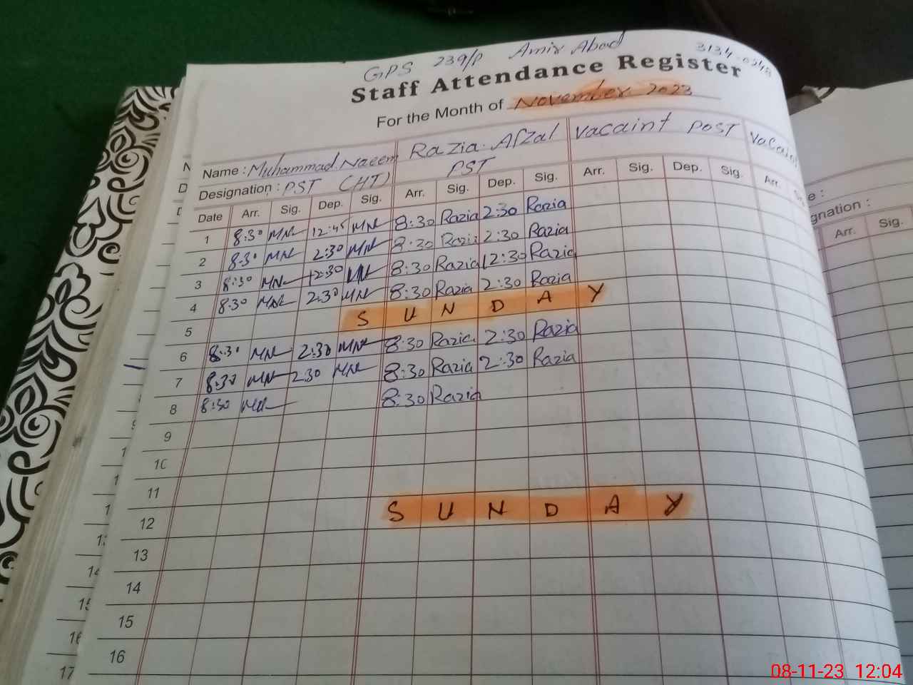 | CNIC | Full Name | Designation | R/C | Absence During Last Calender Month |