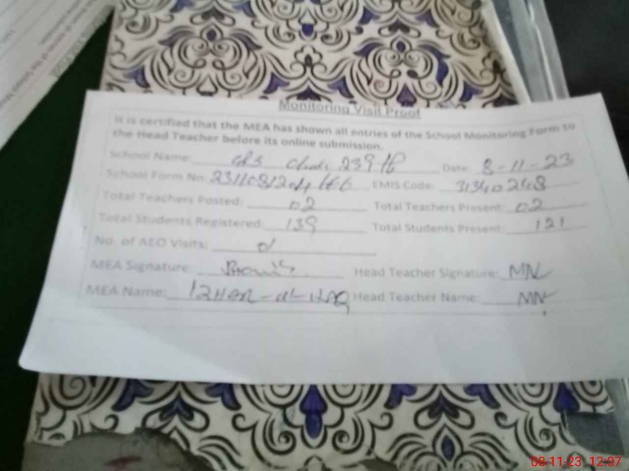 | Attendance Register | Head Teacher | MEA with School | Visit Proof |