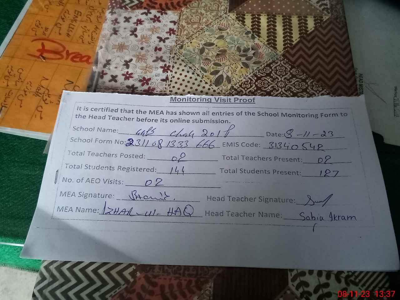 | Attendance Register | Head Teacher | MEA with School | Visit Proof |