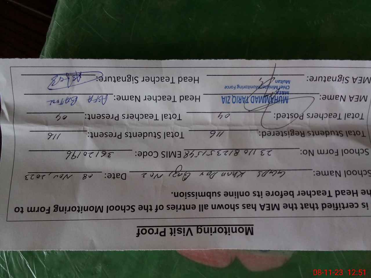 | Attendance Register | Head Teacher | MEA with School | Visit Proof |