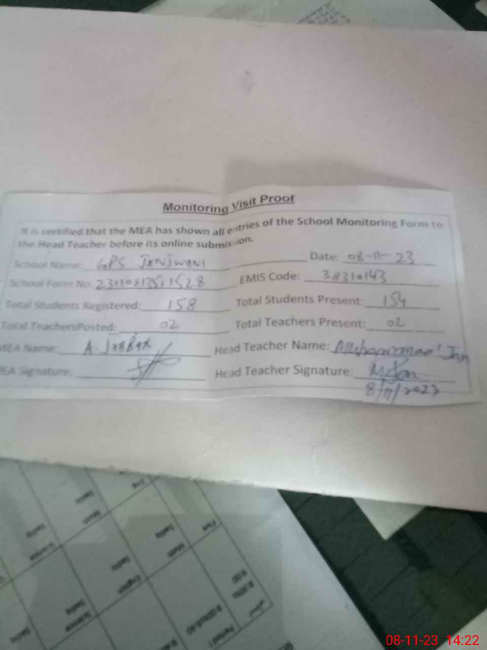 | EMIS Code: 38310143 | Name of School: GPS JANJWANI | |||