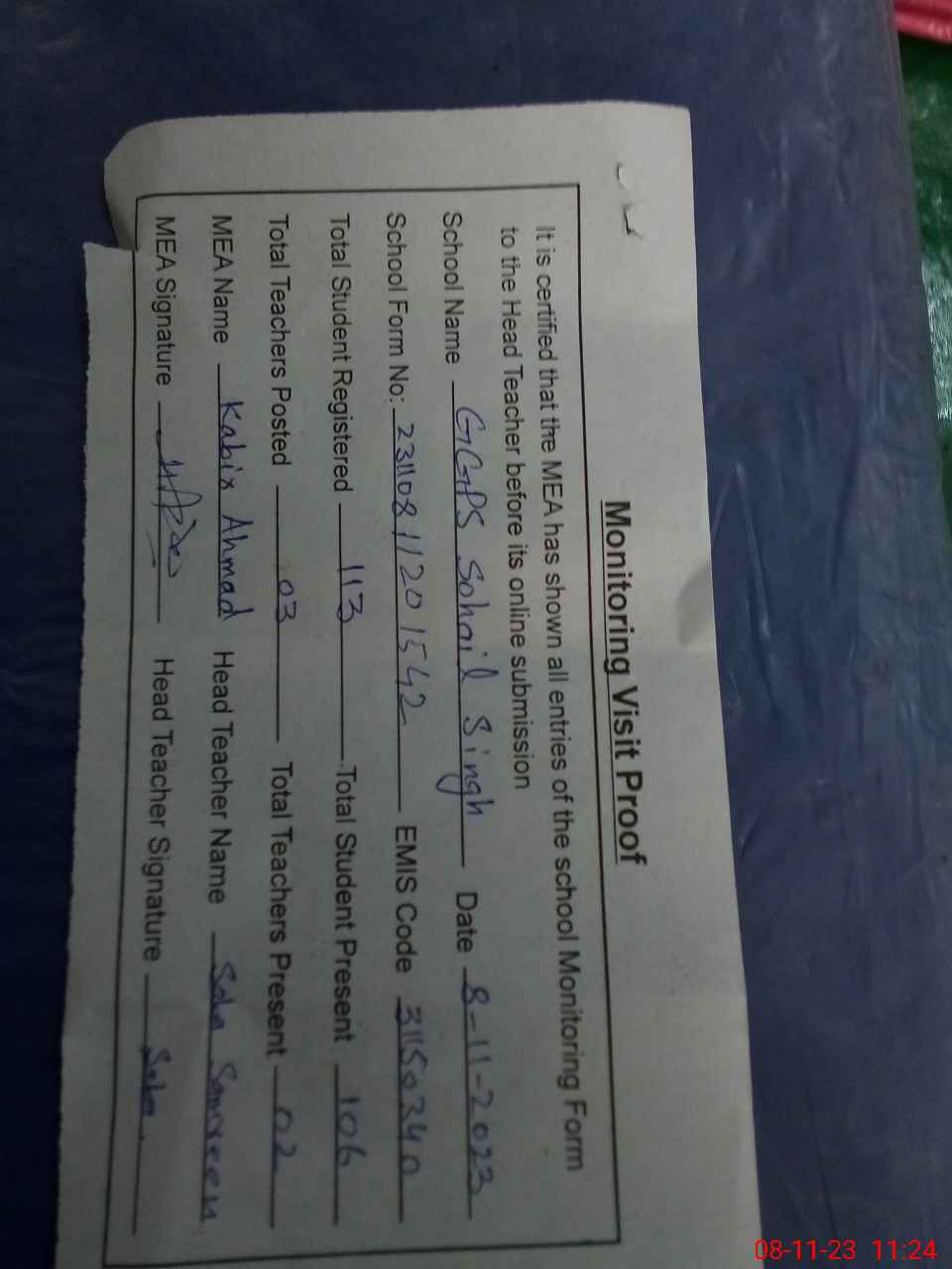 | Attendance Register | Head Teacher | MEA with School | Visit Proof |