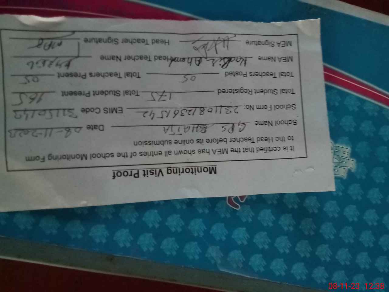 | Attendance Register | Head Teacher | MEA with School | Visit Proof |