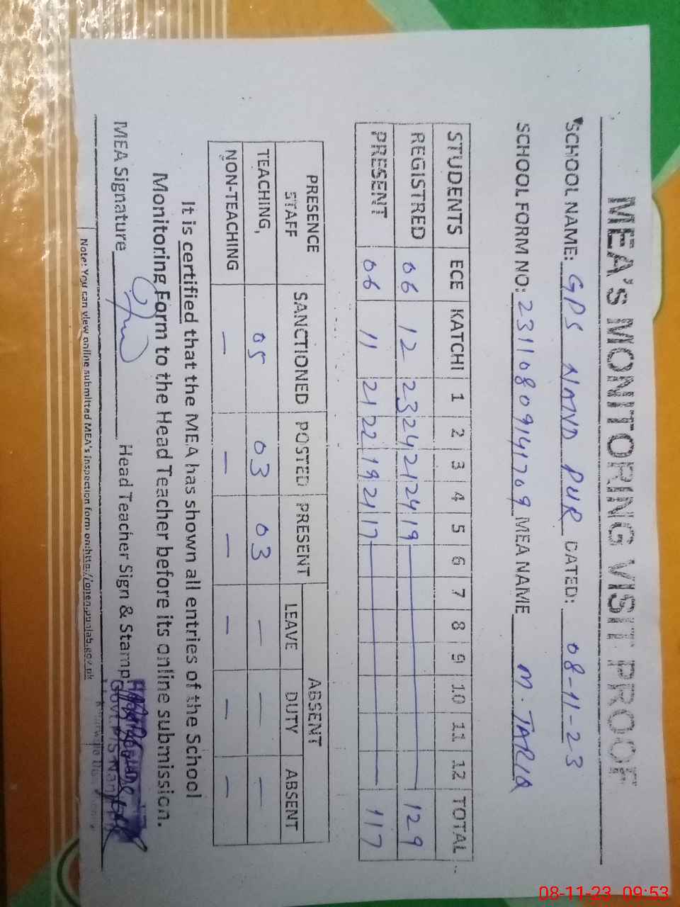 | Attendance Register | Head Teacher | MEA with School | Visit Proof |