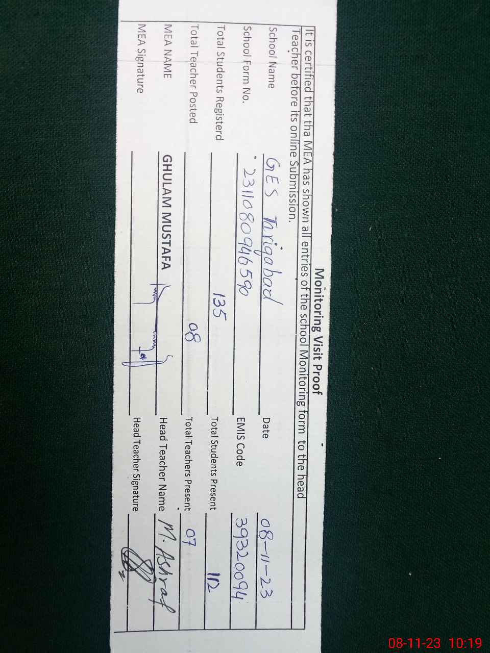 | Attendance Register | Head Teacher | MEA with School | Visit Proof |