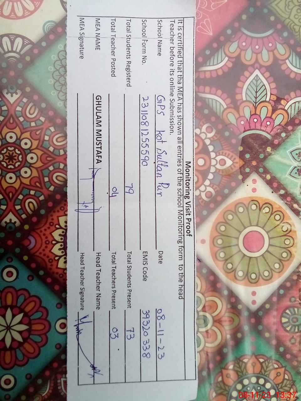 | EMIS Code: 39320338 | Name of School: GPS KOT SULTAN PUR | |||