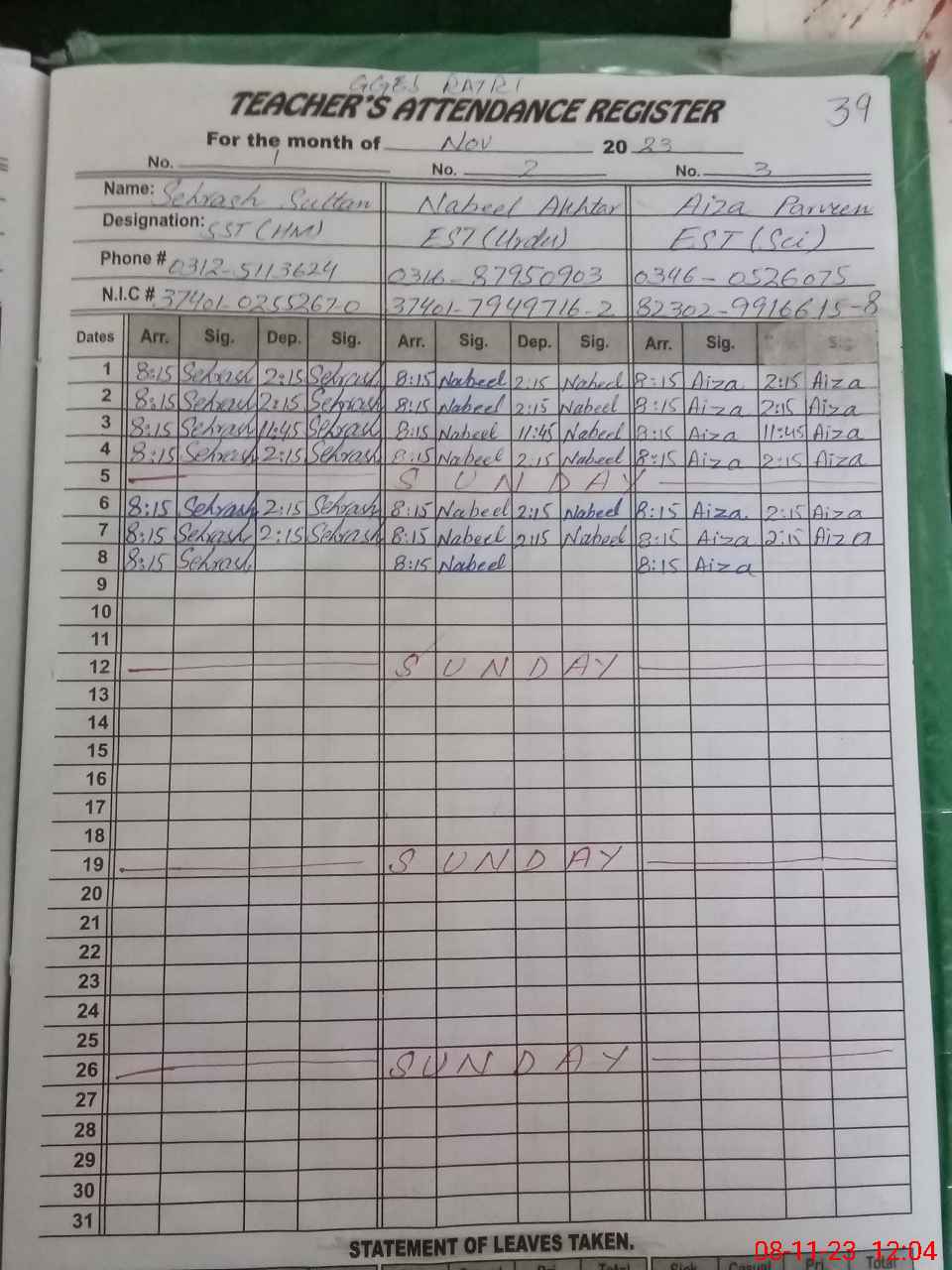 | CNIC | Full Name | Designation | R/C | Absence During Last Calender Month |