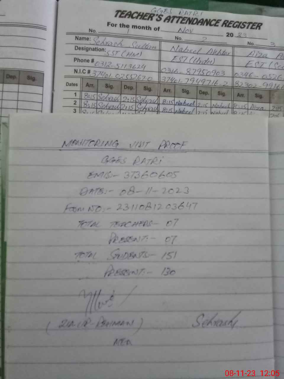 | Attendance Register | Head Teacher | MEA with School | Visit Proof |