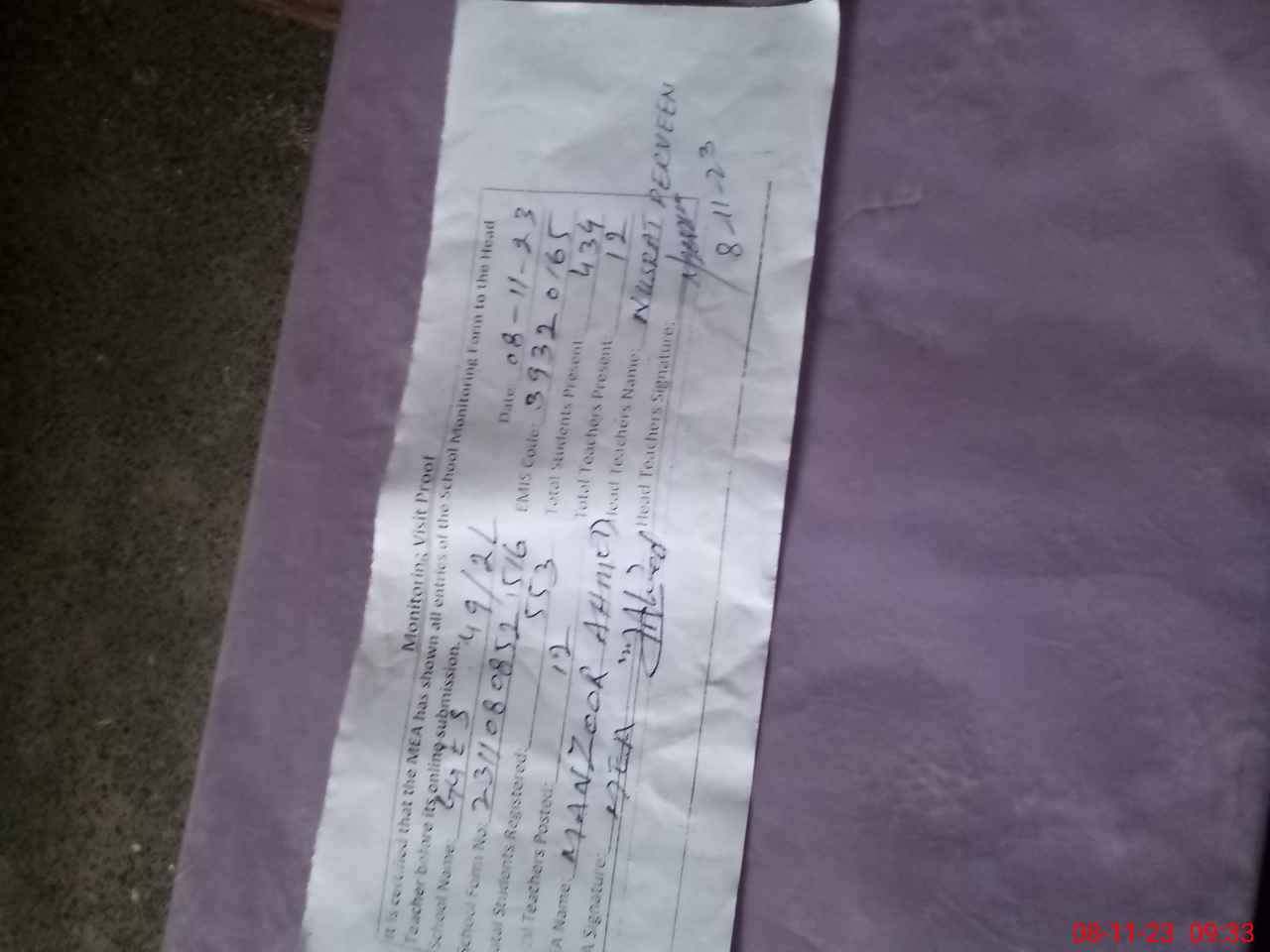| Attendance Register | Head Teacher | MEA with School | Visit Proof |