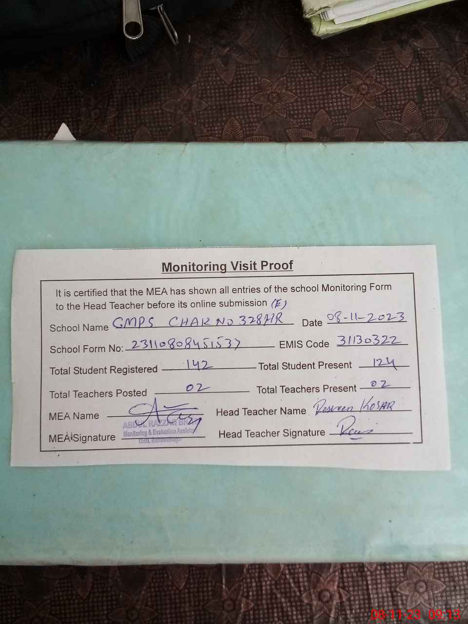| Attendance Register | Head Teacher | MEA with School | Visit Proof |