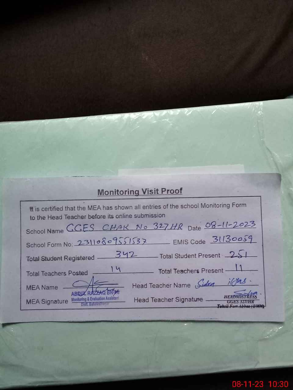 | Attendance Register | Head Teacher | MEA with School | Visit Proof |