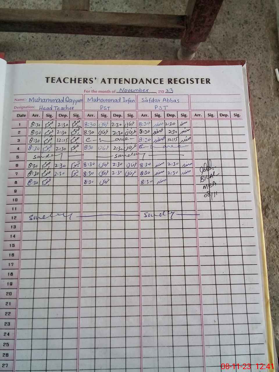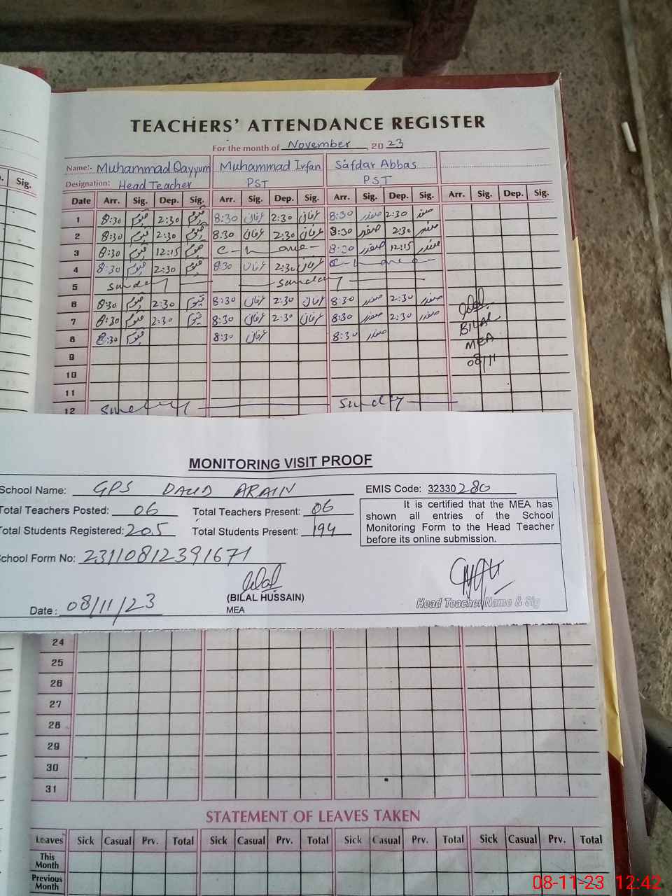| Attendance Register | Head Teacher | MEA with School | Visit Proof |