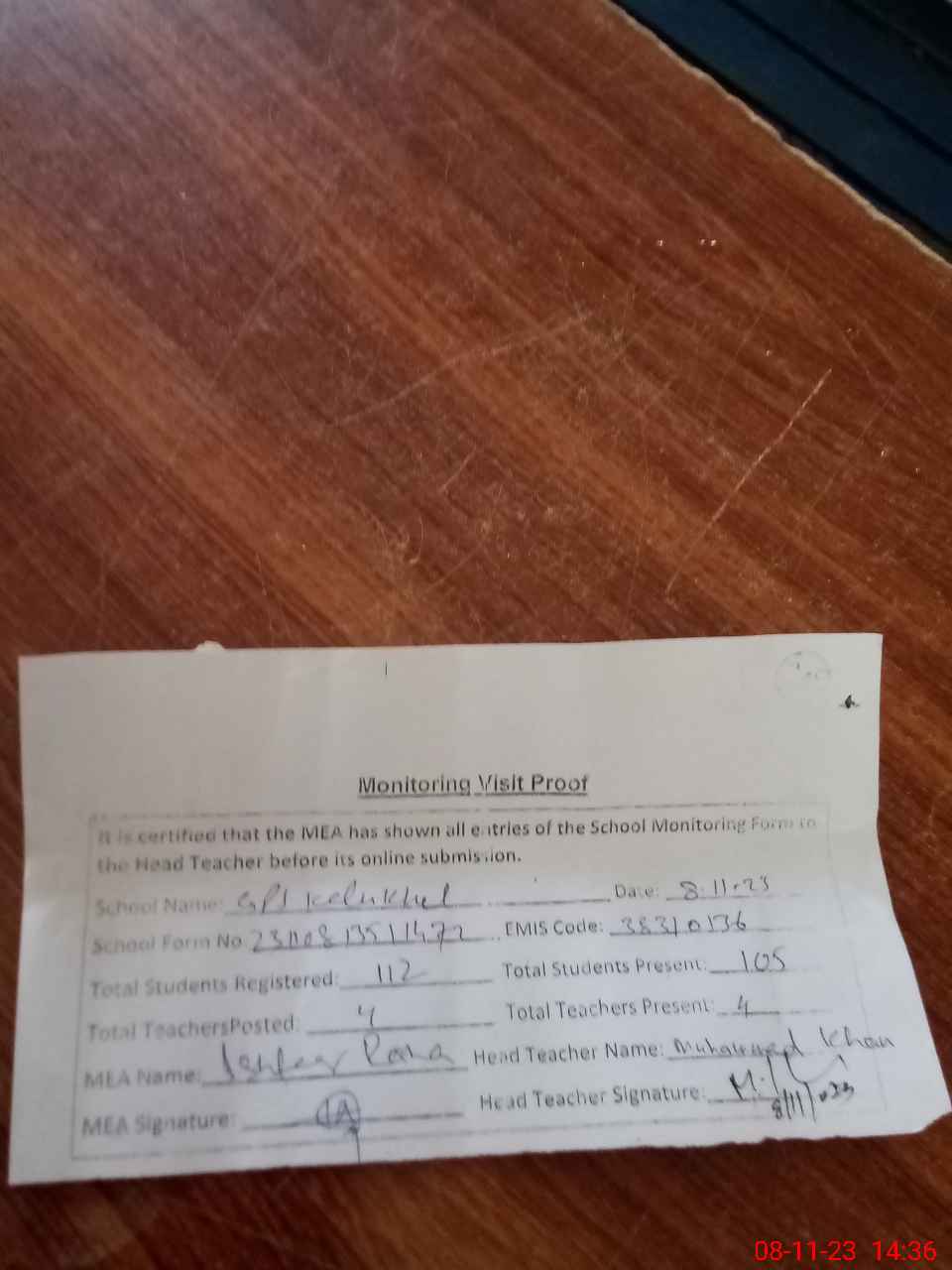 | Attendance Register | Head Teacher | MEA with School | Visit Proof |