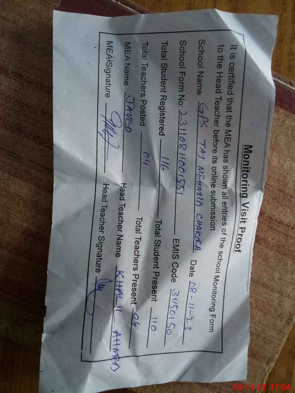 | Attendance Register | Head Teacher | MEA with School | Visit Proof |